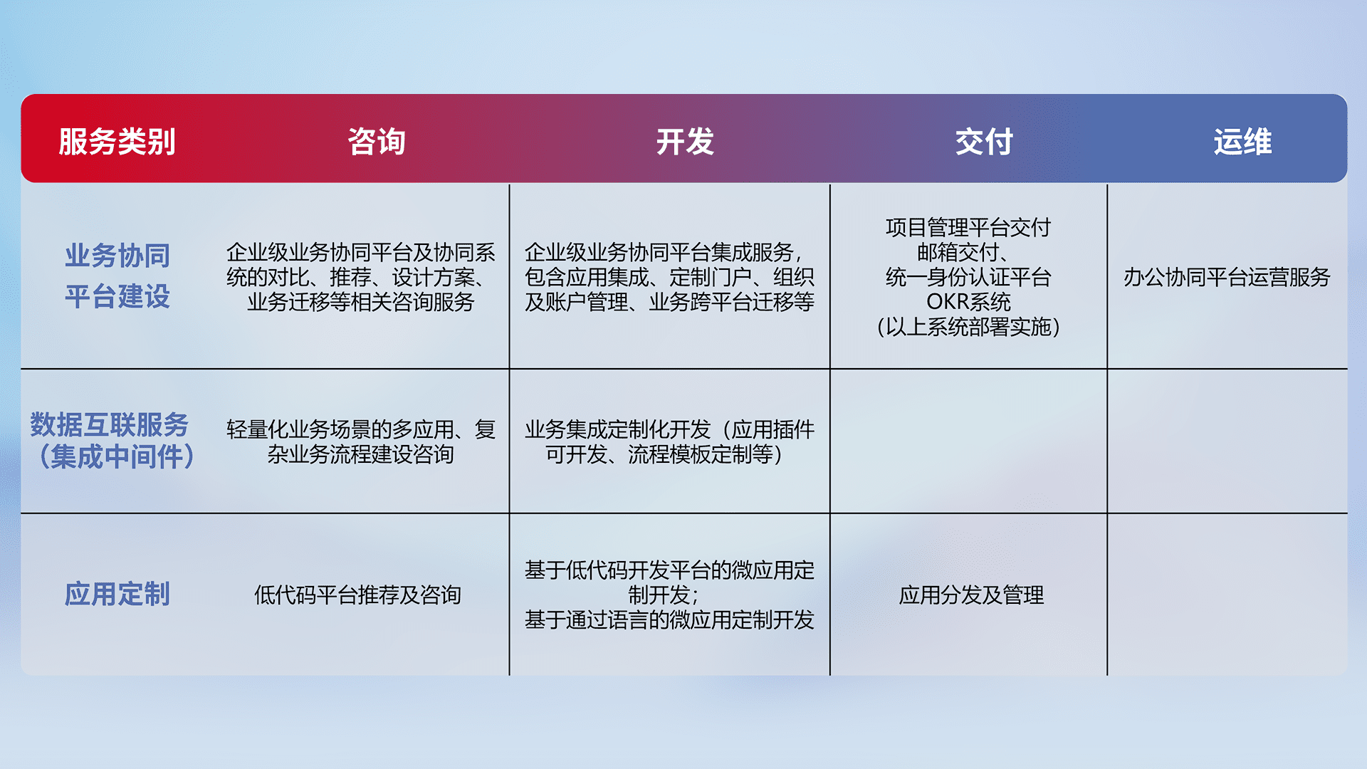 针对钉钉、、企微、、、IDaas等平台级产品提供产品的规划、、、、方案、、交付、、、定制化开发等服务,,实现如统一协同办公、、、、智能客户服务、、、、混合会议管理、、、、智能数据查询、、等业务场景,,实现数字化转型。。