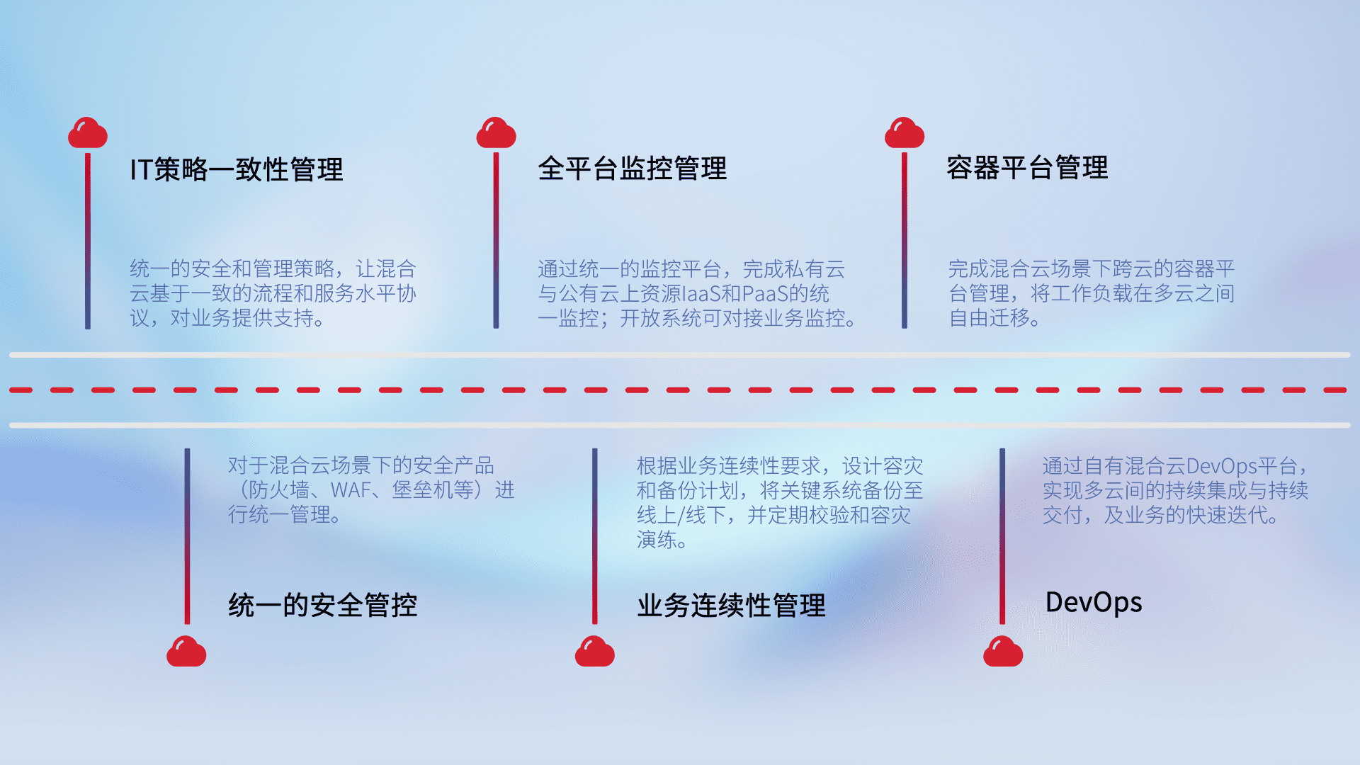 通过多云纳管,,,以统一的资源数据模型把客户的云资源进行抽象和封装,,,进而实现对多云资源的统一操作,,,,保障云资源管理的可靠性、、稳定性与可用性。。量身定制化运维内容,,配置、、开发运维、、补丁管理、、、备份、、、监控、、、认证和访问管理、、审计和日常巡检等,,,保障在用云过程中的可靠度,,稳定度以及高可用率。。
